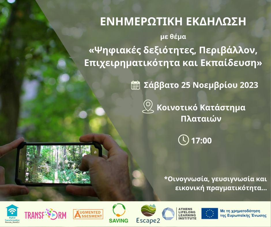 You are invited to the Erasmus+ Multiplier Event on “Digital Skills, Environment, Entrepreneurship and Education, Training Opportunities and Entrepreneurship Support” to be held on Saturday the 25th of November at Plataies Community Centre at 17:00. The event is organised by the Athens Lifelong Learning Institute in cooperation with the Cultural Association of Plataies.